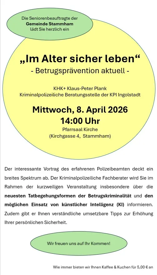 Der interessante Vortrag des erfahrenen Polizeibeamten deckt ein breites Spektrum ab. Der Kriminalpolizeiliche Fachberater wird Sie im Rahmen der kurzweiligen Veranstaltung insbesondere über die neuesten Tatbegehungsformen der Betrugskriminalität und den möglichen Einsatz von künstlicher Intelligenz (KI) informieren. Zudem gibt er Ihnen verständliche und umsetzbare Tipps zur Erhöhung Ihrer persönlichen Sicherheit.